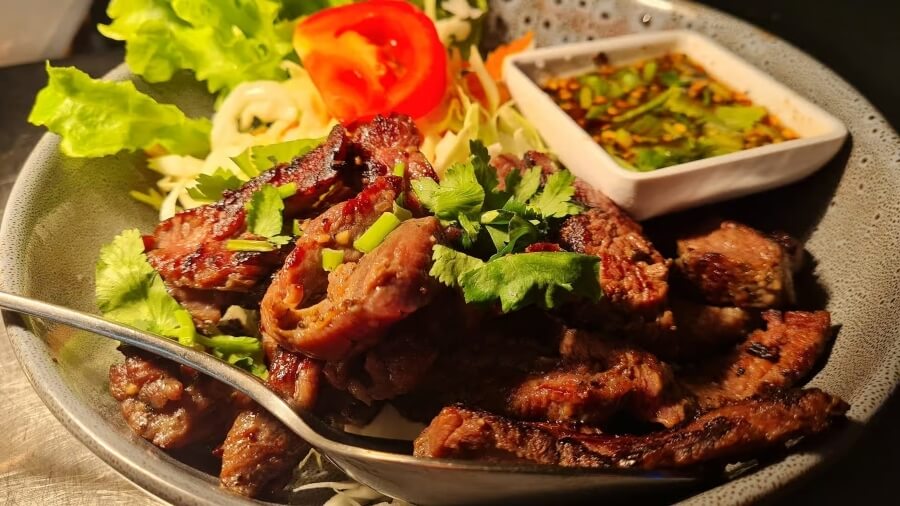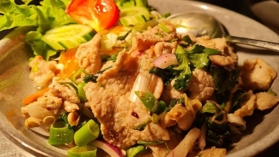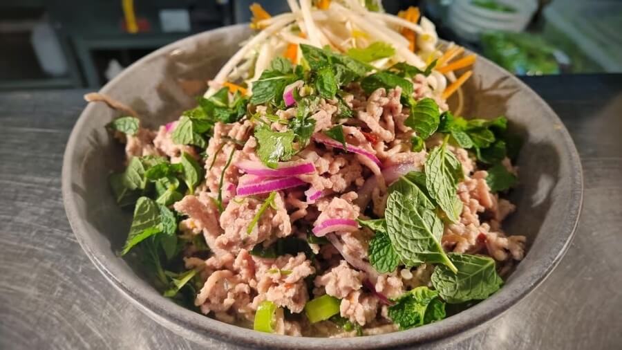 Grilled pork or beef sliced & tossed with Thai toasted rice crumbs & chilli powder, onion, red coriander, spring onion, kaffir lime leaves & lime juice.