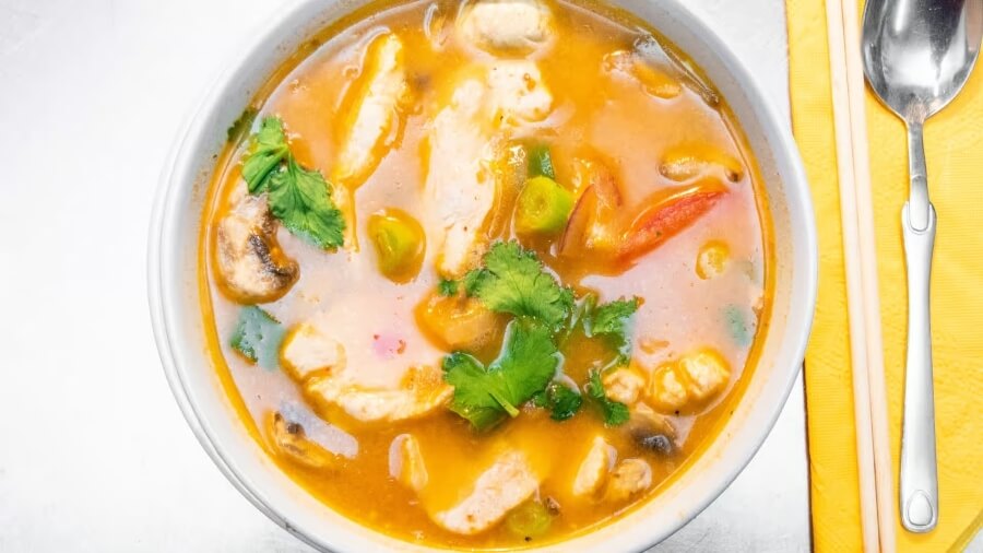 Hot and sour spicy soup with milk, lime leaf, galangal, lime juice, tomato, coriander & mushroom