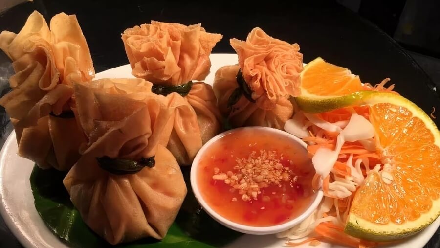 Vegetarian. Vegan option. Crispy, deep-fried pastry purse served with sweet chilli sauce.