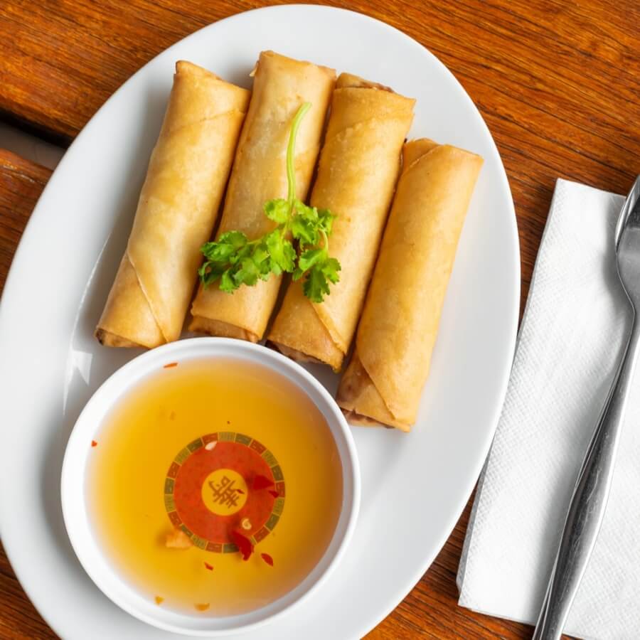 Vegetarian. Chicken or vegetarian spring rolls with thana's special sauce.