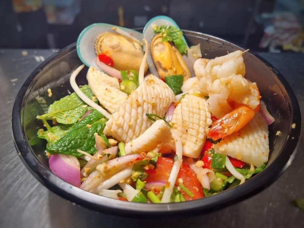Seafood with chillies, red onion, coriander, Thai herbs & lemon juice served with salad