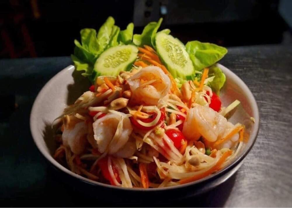 (Papaya Salad with or without Cucumber) Add seafood for an added price. The famous salad from the north eastern realms of Thailand shredded green papaya with traditional Som tom sauce. Tossed with roasted peanut & cherry tomatoes. To enjoy Thai Tastic experience, a side of BBQ beef or chicken is a must (order separately).