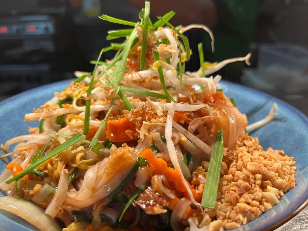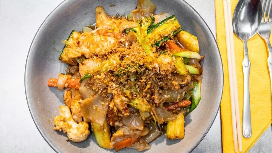 Thin rice noodles with egg, vegetables, bean sprouts & served with crushed peanuts