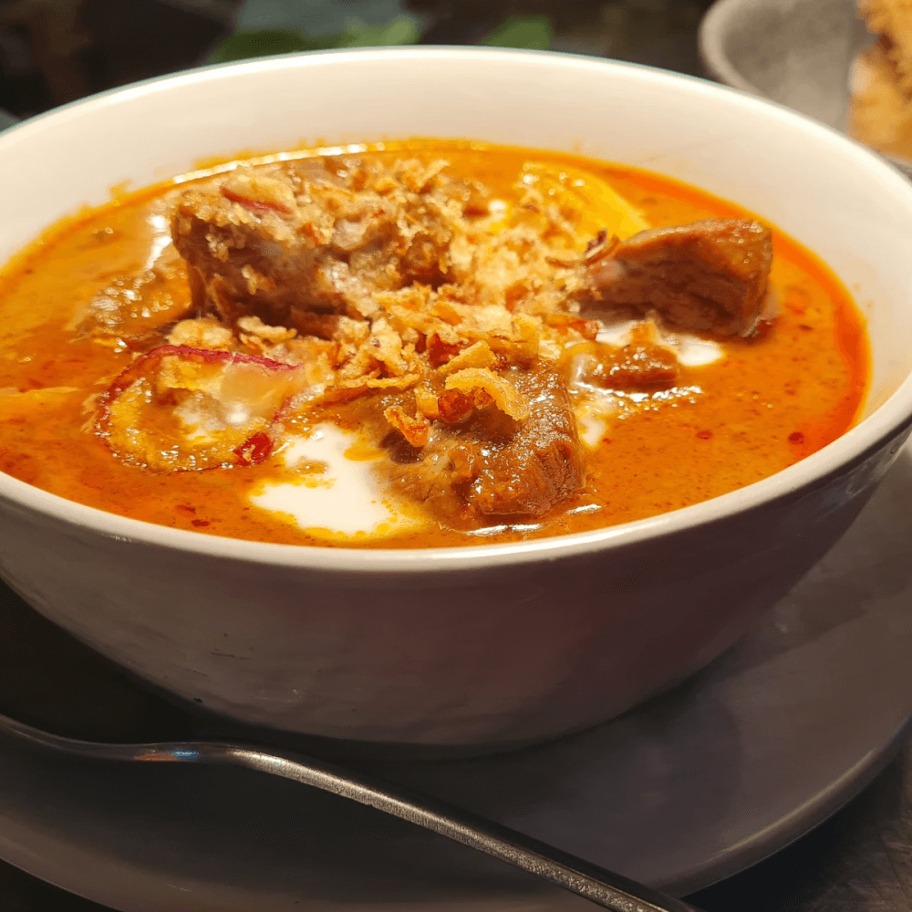 Spicy thick red curry with lime leaves, carrots, long banana chillies & beans